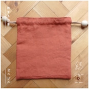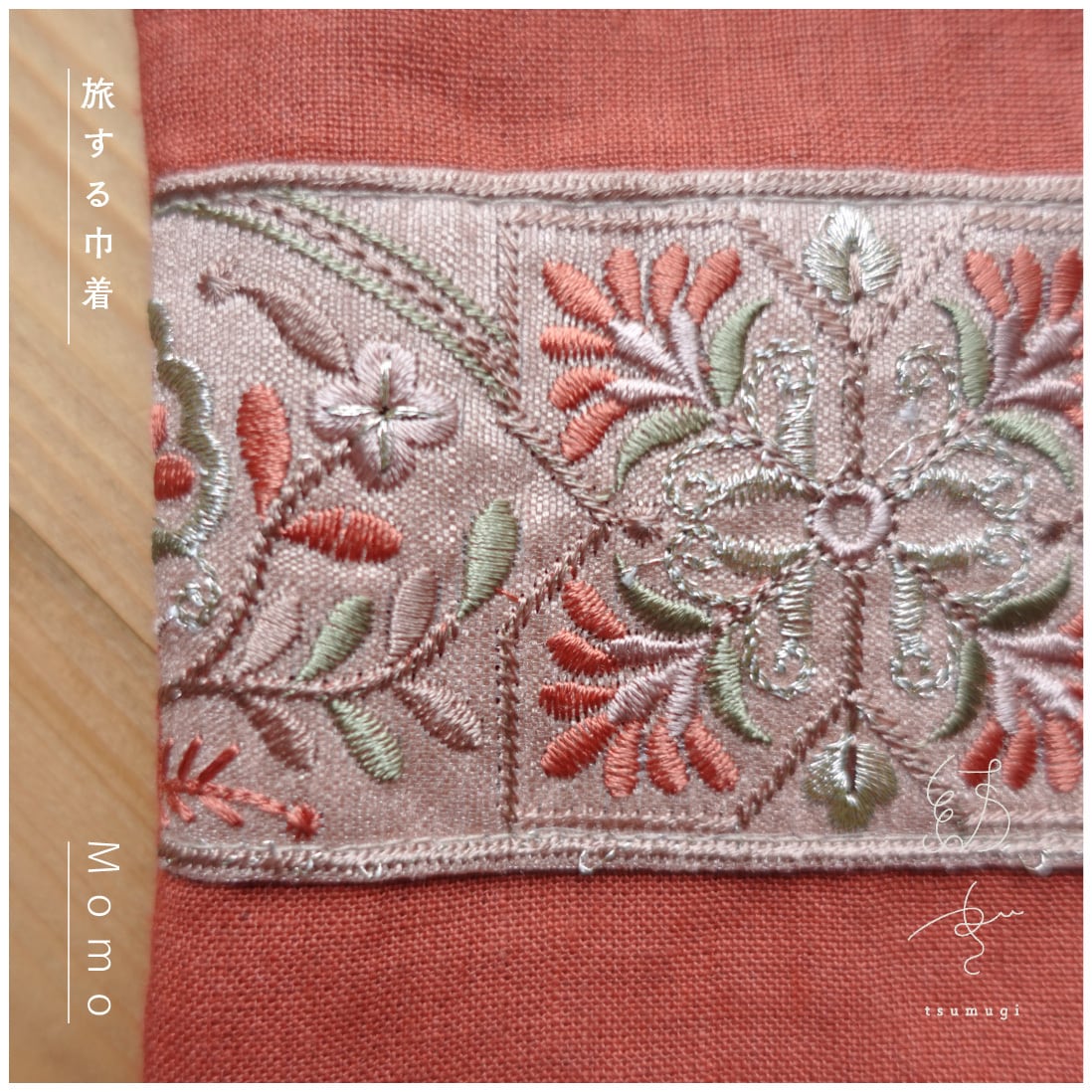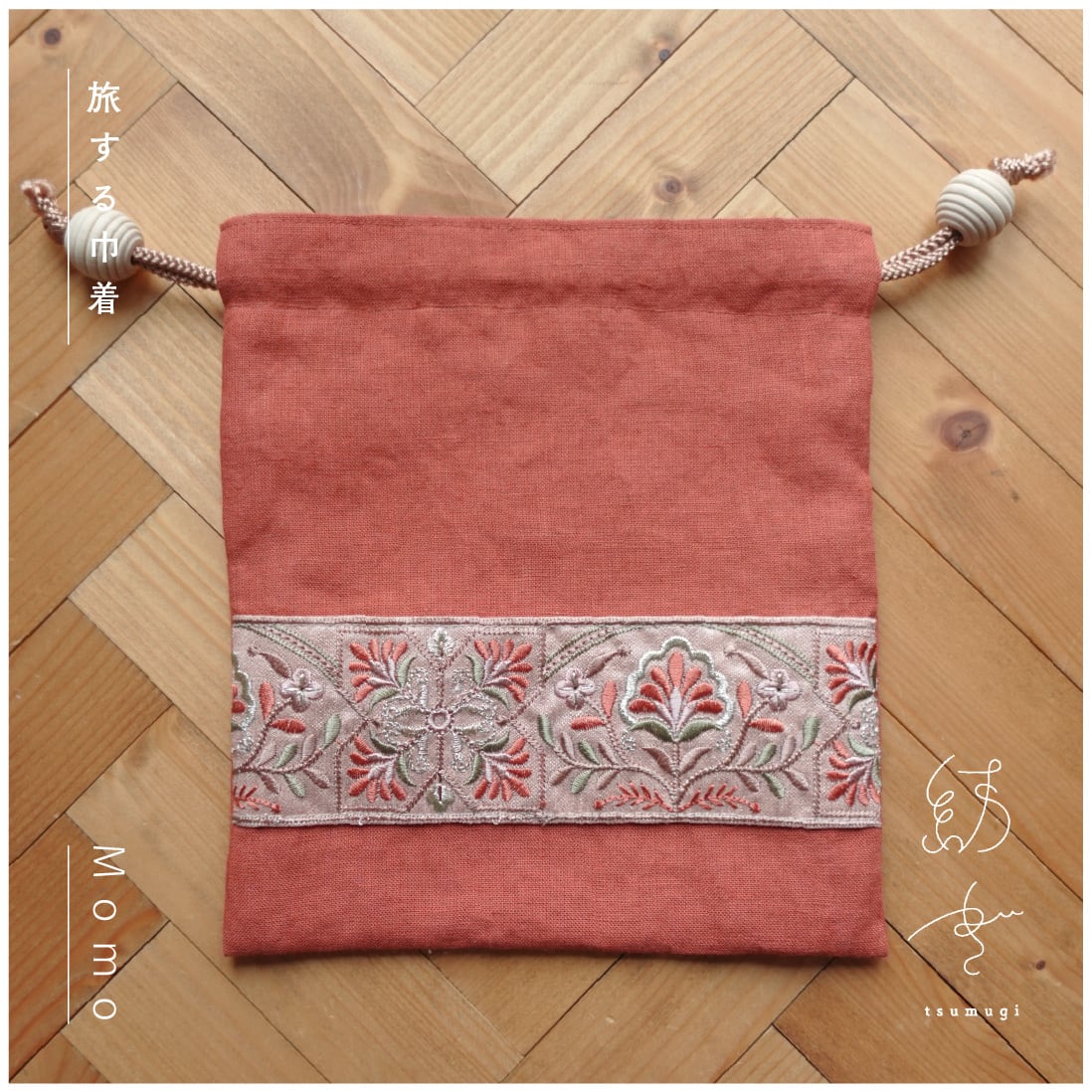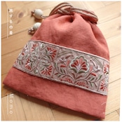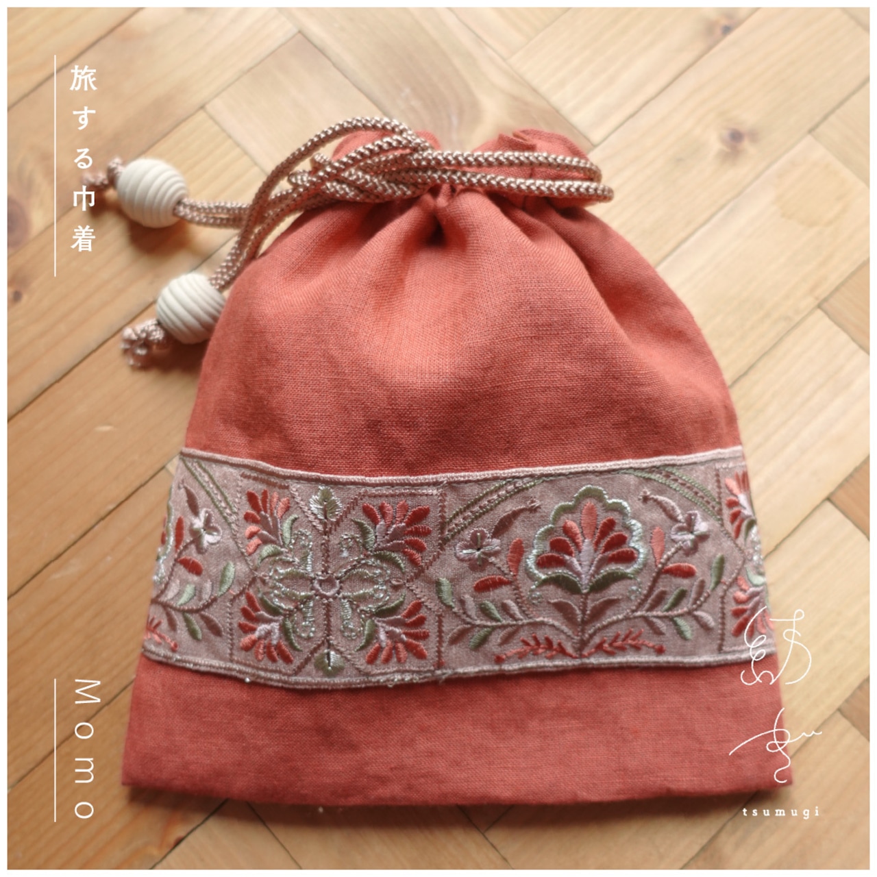 anzu…柔らかくて肌触りの良いリネンに、 可憐な花模様の刺繍が咲く。やさしいアプリコットカラーのリネン。大切な持ち物を入れるとコロンと丸く、あんずのようにとても可愛らしいので、この名前をつけました。