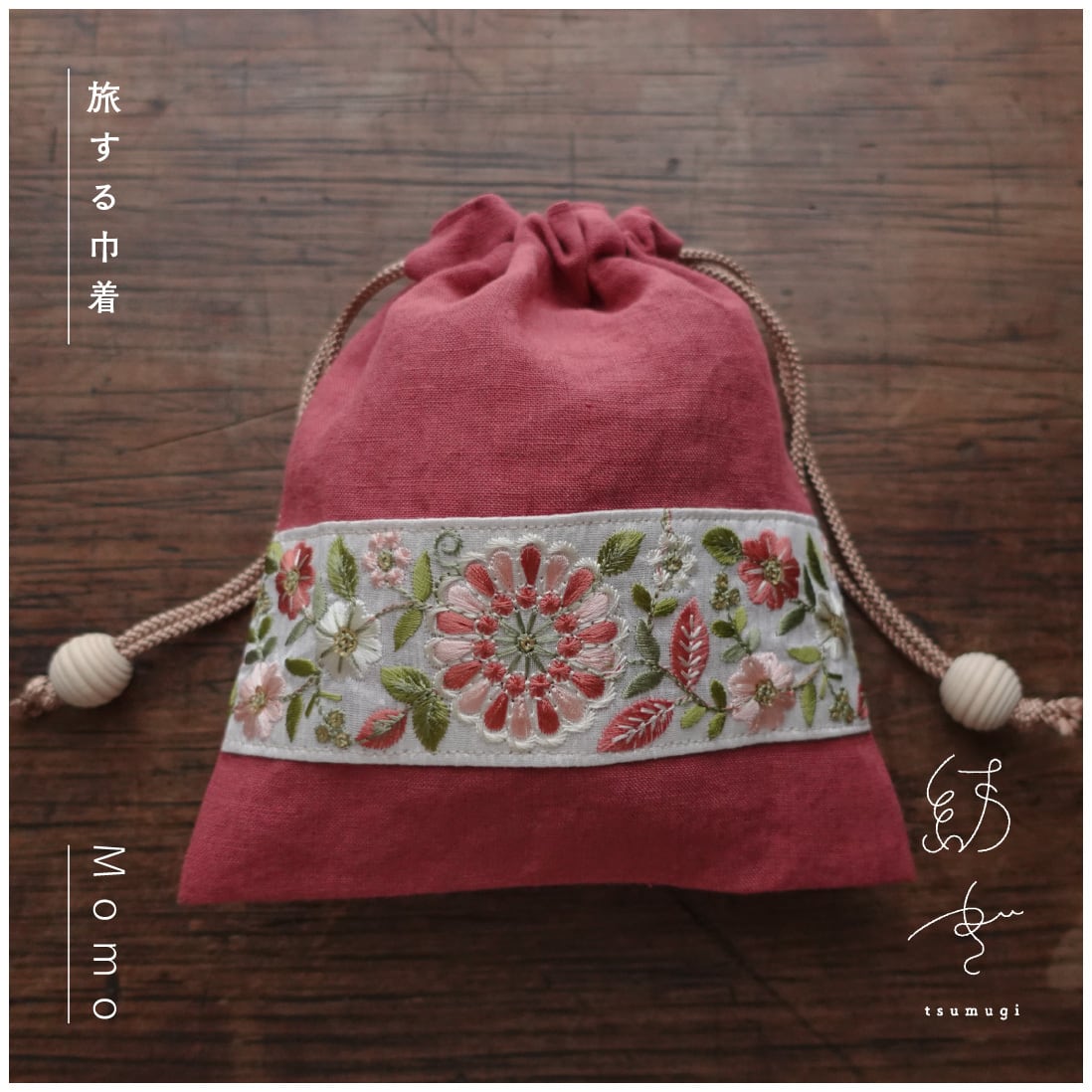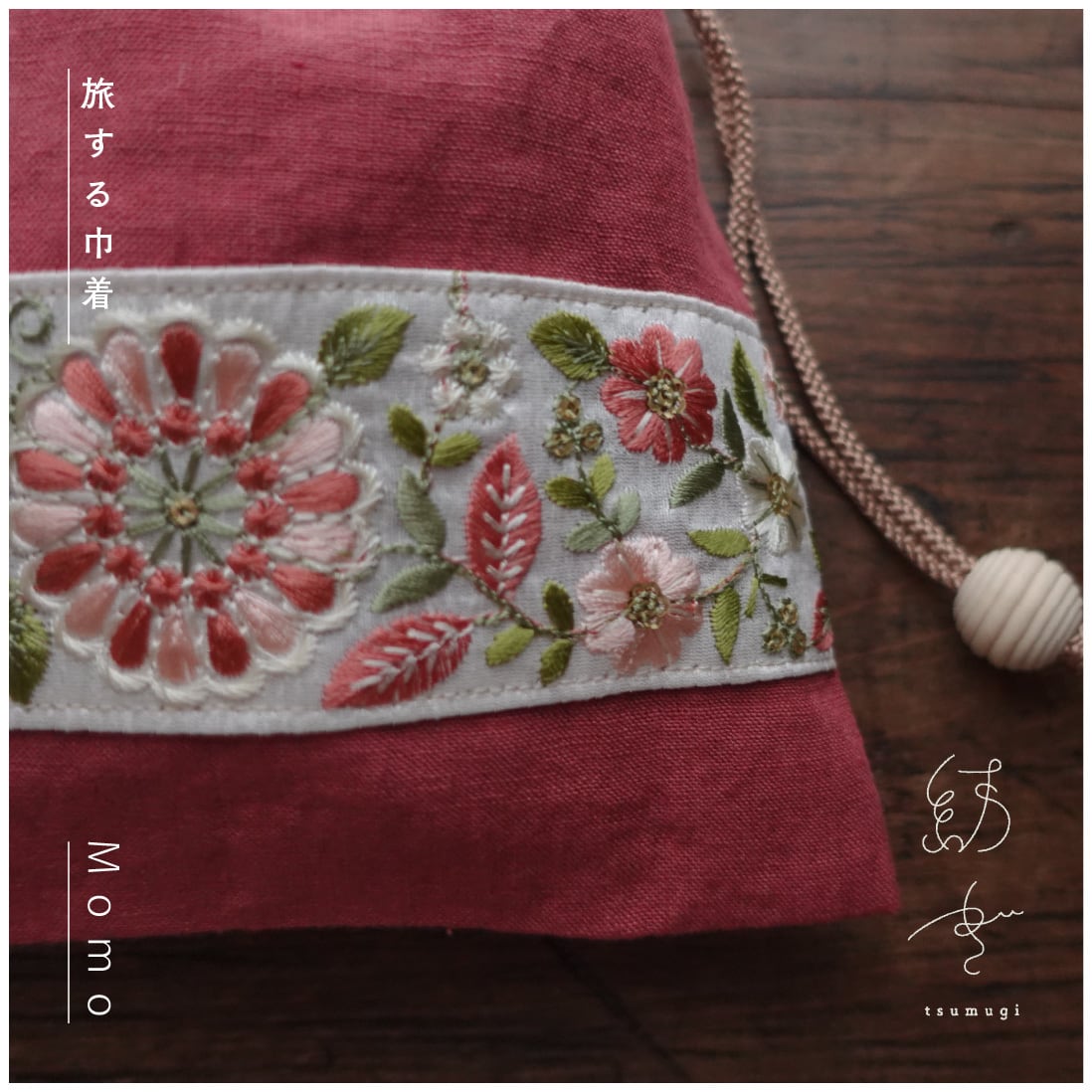 Momo…柔らかくて肌触りの良いリネンに、 刺繍とビーズが華やかなインドテープの花が咲く。
